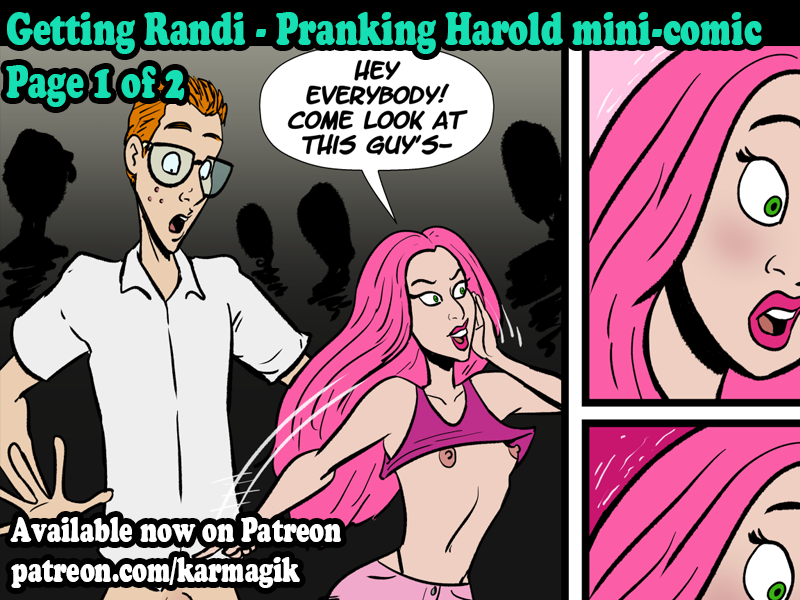 Getting Randi: Pranking Harold – Page 1 of 2 Getting Randi: Pranking Harold – Page 1 of 2 published on November 12, 2025Read more posts by the author of Getting Randi: Pranking Harold – Page 1 of 2, karmagikNo Comments on Getting Randi: Pranking Harold – Page 1 of 2 A two page mini-comic of Getting Randi characters. Full page available in High Resolution for Patreon Supporters.