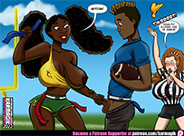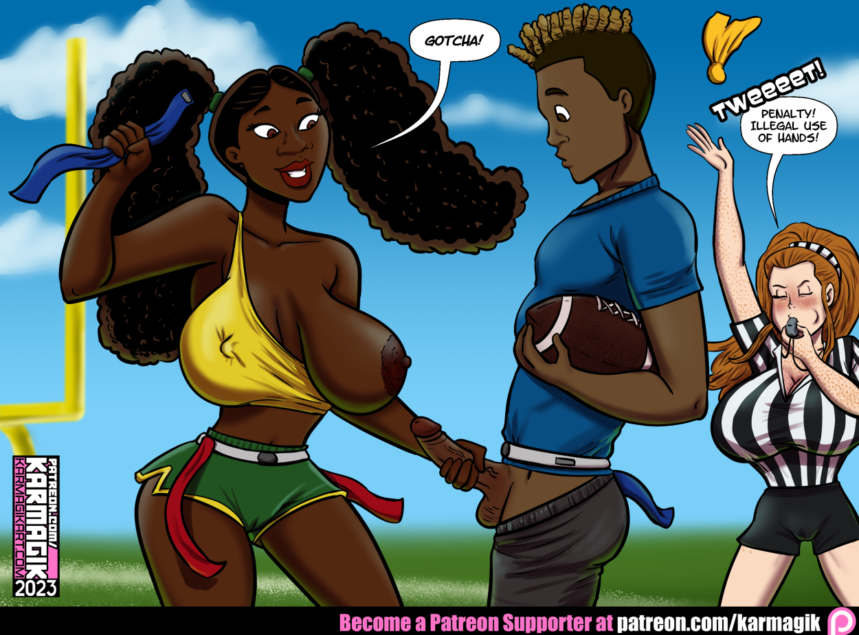Yolanda gets the flag, then gets flagged during a game of intramural Flag Football at Fawndell University. I say let ’em play, ref!