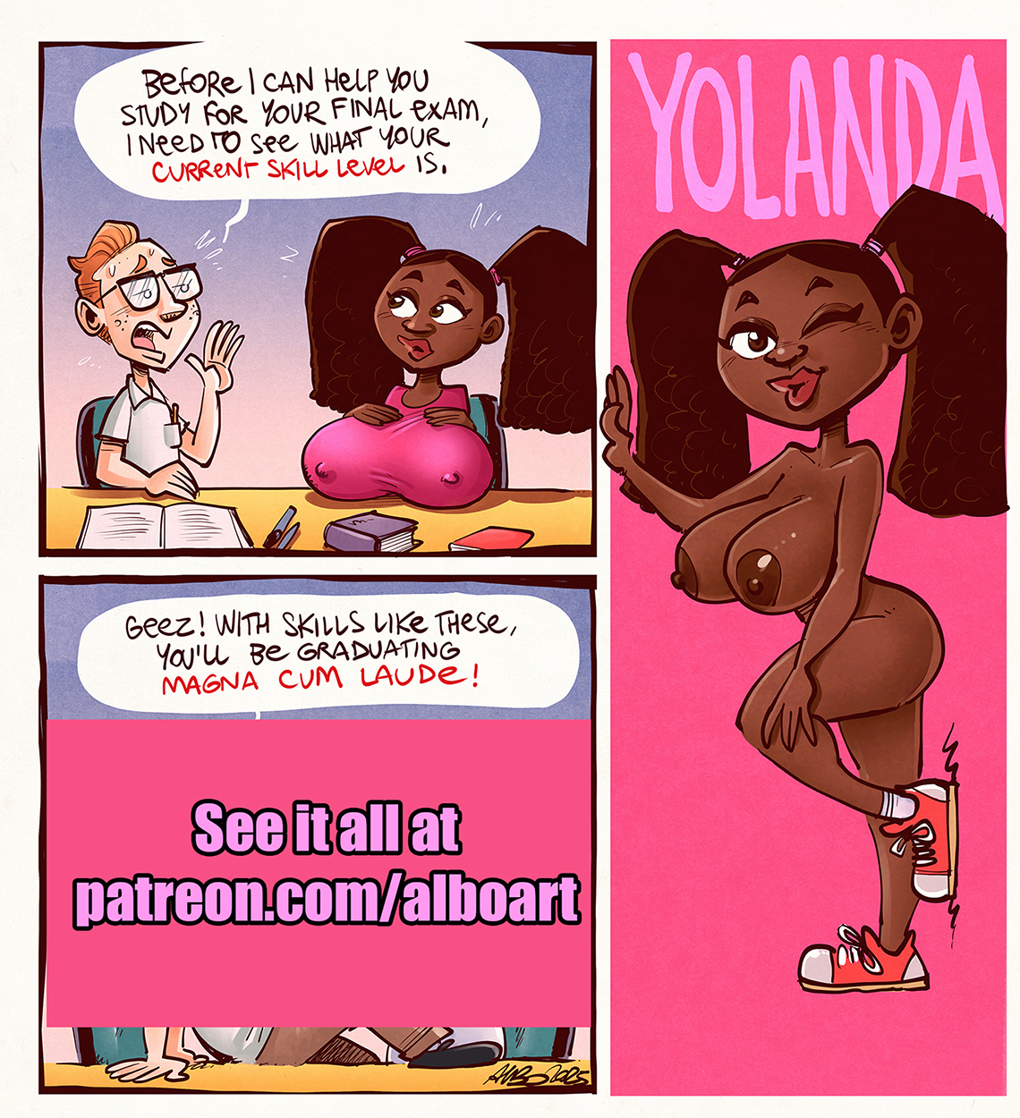 Albo did a two panel comic featuring a toon version of Yolanda (with Harold) from Getting Randi. If you want to see the full comic, you’ll have to support him on Patreon (which is well worth it!). He also did a pin-up version of toon Yolanda to accompany the strip.