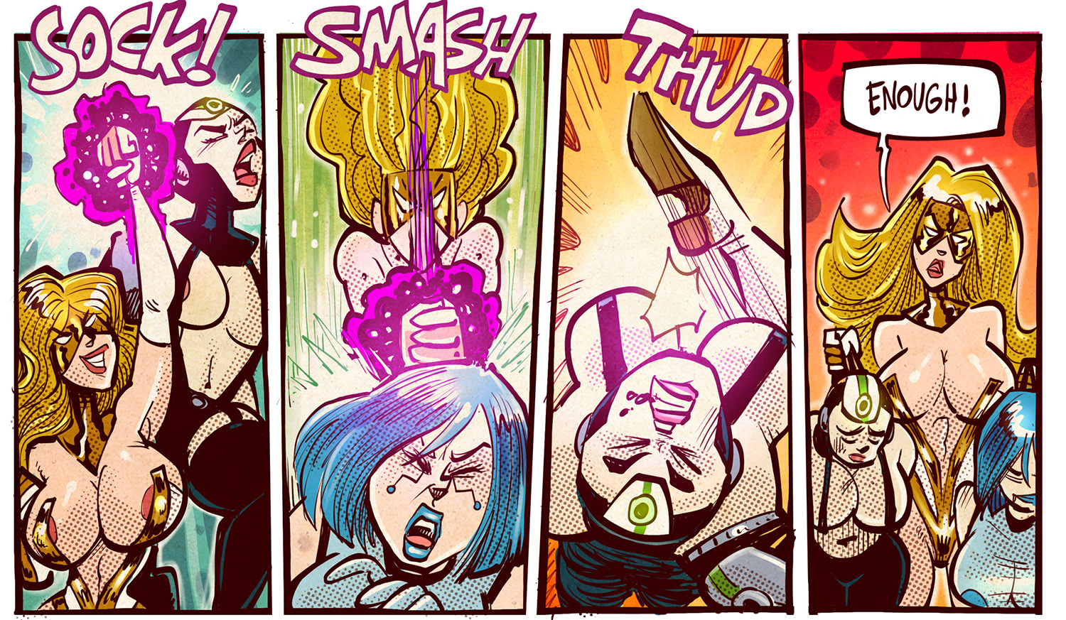 My characters from Thrills of Victory, Lady Victory fighting the fembots, Circuitina and Bionica.